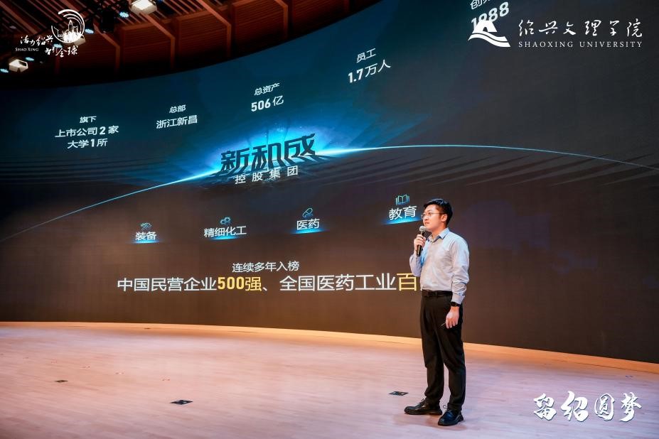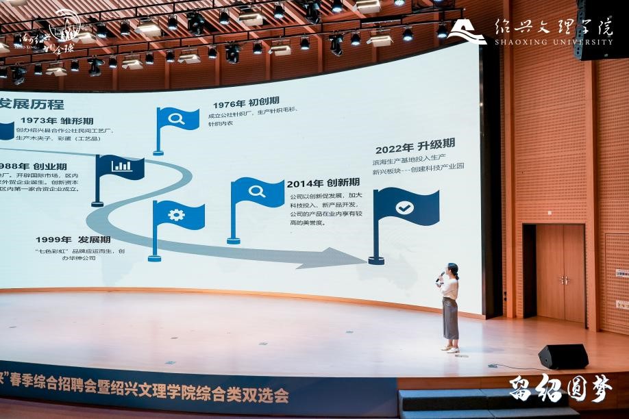 我校优秀校友、留绍代表——绍兴三花新能源汽车部件有限公司人力资源部高级经理王平分享在校学习和就业的经历;上虞区人社局副局长钱晓婧介绍了实践基地建设背景和支持举措;市人社局人才专员周欣向参会学生进行绍兴城市及人才政策宣讲;浙江新和成股份有限公司HR金仲杰、浙江七色彩虹控股集团有限公司人力资源部经理张银萍作现场推介。