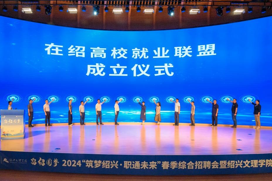 绍兴市教育局党委委员马成永、绍兴市人才发展集团董事长黄茹和在绍12所高校就业部门负责人共同上台见证“在绍高校就业联盟”成立。