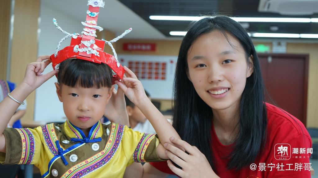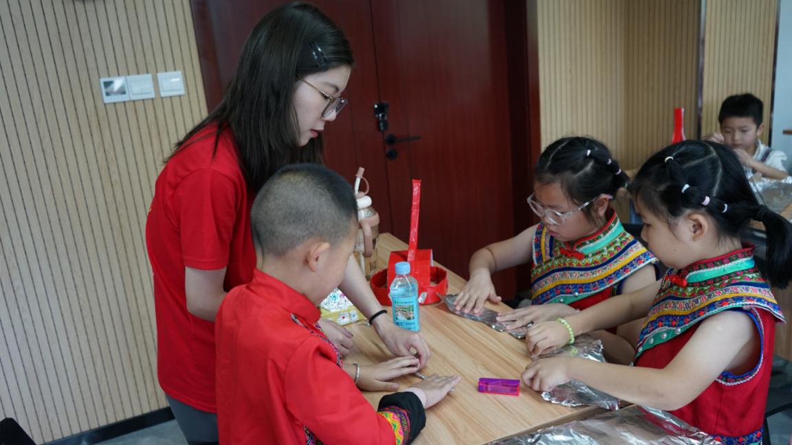 山中出凤凰,凤凰出“山哈”。在浙南的青山绿水间的畲乡景宁,志愿者精心设计并围绕“畲族传统服饰”准备了一系列特色课程。作为畲族传统服饰重要组成部分的“凤凰装”是其中不可忽视的一部分,对此,志愿者带领孩子们通过开展手工课程制作属于自己的“凤冠”。在志愿者的带领下,孩子们充分发挥动手能力与创造能力,裁剪瓦楞纸并将其环成圆圈状,利用红色胶带进行固定,在底座基本成型后,通过剪切、折叠、揉搓等多种方式将锡纸粘贴到底座上,最后只要再按照自己的喜好将宝石贴纸装饰到“凤冠”上,一盏独一无二的“凤冠”便诞生了。在动手的过程,不但培养了孩子们的实践能力,还进一步加深了其对畲族传统服饰的认识。