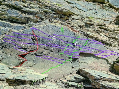 其次,石面上存在两种似台阶状的剥痕类型,致使石面上呈现多个石层。一类是石面左侧“百”字至“可”字(图①红线表示)、“卯”字至第三“翳”字右侧再至“可”字下方、“翳”字下方至“车”字首横再至“年”字中部、“年”字左侧上延至“七”字左侧再至“廿”字中部纵痕、“昆”字下方(图①白线表示)等多道剥痕;另一类是石面右侧“使”字左 侧至“臣”首笔至“以”“昆”之间一直下沿到石面底部、“采”右下侧至第二“翳”字中再至“三”字中的两道剥痕(图①绿线表示)。而石面可以基本分为A、B、C、D四个石层,而且B石层中“三月”“到”区域是较B石层上部“陯”“廿七”“己卯”“此”区域更为凹陷。可以说,石面上裂痕、剥痕错综。