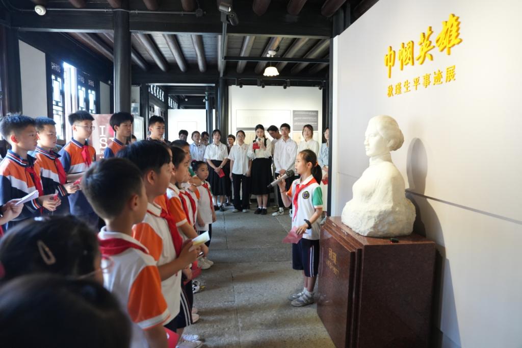 “身不得,男儿列;心却比,男儿烈!”在和畅堂秋瑾故居,全体学生齐声诵读《满江红·小住京华》中的豪迈诗句,声震庭院。这座见证秋瑾从大家闺秀成长为革命先驱的老宅,如今成为青少年汲取力量的精神圣地。大学生宣讲员包学彦、沈佳妮分享了秋瑾童年“不爱红装爱武装”的轶事:偷看兄长习武、研读进步书籍、挑战封建礼教,展现了革命精神的早期萌芽。秋瑾小学的宣讲员则以《小小女侠初长成》为题,用童真语言讲述秋瑾儿时成为“偷学问”的小书虫和成为“小木兰”的故事,再现秋瑾“骑马佩剑、不屈不挠”的童年形象,赢得阵阵掌声。活动尾声,师生们将感悟写在便利贴上,“以吾辈青春,护盛世中华”“做新时代的‘鉴湖女侠’”等真挚留言,铺满展示板,彰显了传承之志。
