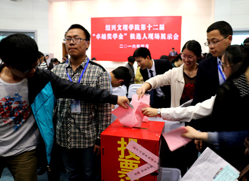 据悉,第十二届“卓越奖学金”评选工作于今年3月正式启动,评奖分为社会评选、校内投票站投票及现场展示会三个环节,权重分别为:25%、25%、50%。最后根据投票结果和权重进行综合排名。经校党委会讨论后,确定获奖人员及等级,并报请韩启德副主席夫妇和绍兴市人民政府同意,最终产生6位卓越奖学金获得者。