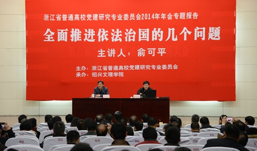 12月25日晚上,浙江省普通高校党建研究专业委员会2014年年会专题报告在我校铁城科教馆举行。我校杰出校友、著名学者、政治学家、博士生导师、中共中央编译局副局长俞可平应邀作了主题为《全面推进依法治国的几个问题》的专题报告。