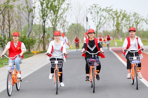 迪荡湖公园设有专用的骑行车道,全程5.01公里,沿途有绿意盎然的丰富植被,波光粼粼的湖水在阳光下闪耀,同学们在享受骑行的过程中,也能欣赏到沿途的风光。湖畔清凉的风吹在同学们一张张洋溢着快乐的笑脸上,交织出文理环保青年特有的美丽春光。