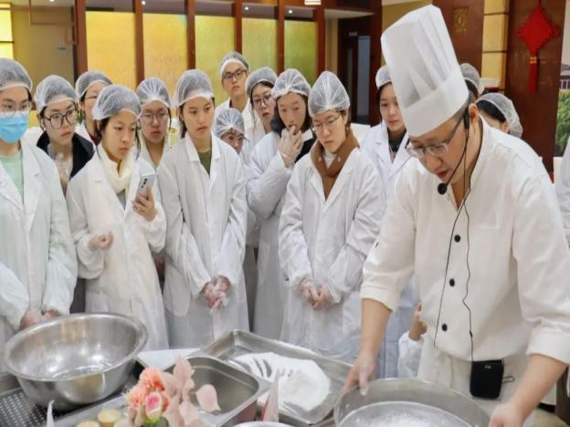 12月7日,在河西教工餐厅,在食堂大厨的指导下,同学们先后完成了绍兴特色小吃桂花糕、奶油小攀的制作。