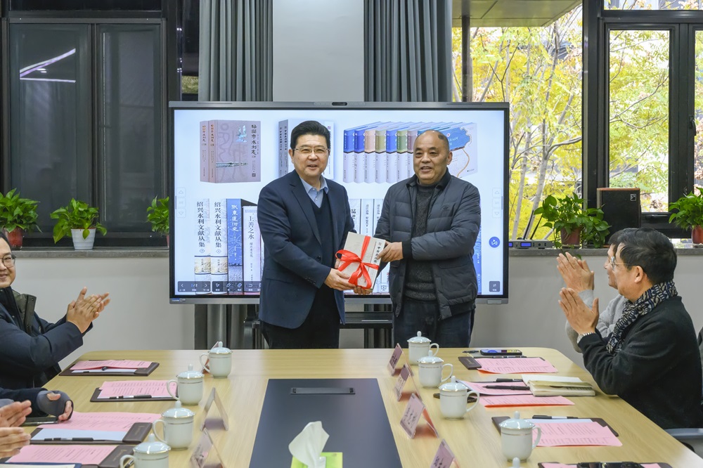 交流会前,举行了书籍捐赠仪式。绍兴市鉴湖研究会会长邱志荣向高等人文研究院捐赠书籍,崔凤军为邱志荣颁发捐赠证书,表示诚挚谢意。人文社科处处长、高等人文研究院常务副院长诸凤娟主持捐赠仪式。
