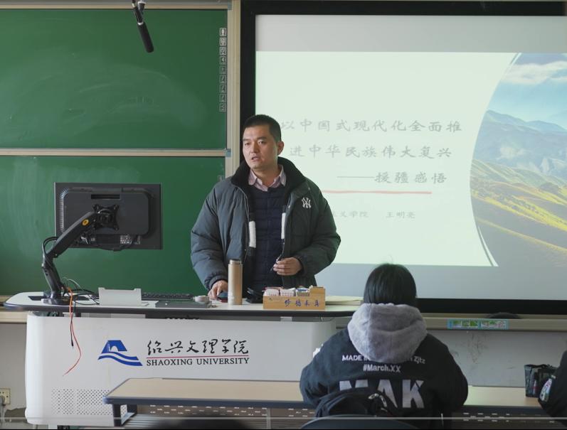 “阿瓦提县纺织产业园的建设,鲁迅幼儿园、小学、中学的设立,阿克苏地区的柯柯牙绿化工程落地,都展示了绍兴在经济、教育和生态等方面对新疆的支援”。教师王明亮结合自己援疆支教工作的经历,以“对口支援”这一中国特色的扶贫方式生动解读了“以中国式现代化全面推进中华民族伟大复兴”这一主题。