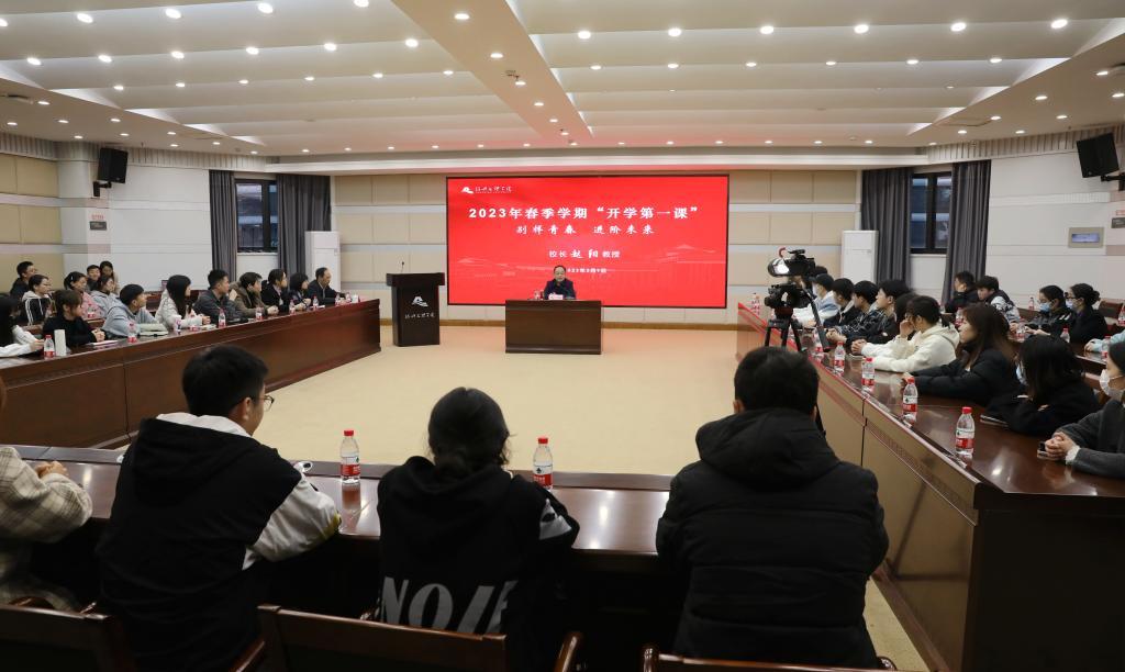 “同学们的如约返校,让寂静冷清的校园重新焕发出生机和活力,有你们真好”,校长赵阳深情饱满地讲授“开学第一课”。他回顾了三年来,以习近平同志为核心的党中央团结带领中华儿女抗击疫情、战胜疫情的伟大实践和成就,分析了中国经济社会发展长期向好的大势,阐释了中国式现代化道路的核心要义,叮嘱同学们牢记习近平总书记的殷殷嘱托,胸怀山河、挺膺担当,希望同学们“坚定理想信念,厚植爱国爱校情怀”“勇毅笃行,惟实创变”“眼里有光芒,心中有诗意”,不断锤炼品德修为、练就过硬本领,以奋斗之姿展现别样青春。