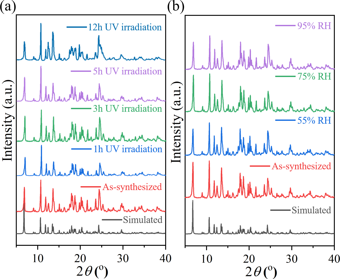众所周知,结构稳定性决定了材料是否具有应用前景。在该研究工作中,作者利用粉末X射线衍射技术(PXRD)验证了在光照和加湿条件下材料的结构稳定性。如图ab所示,紫外光照射12小时或湿度95 %条件下,材料的PXRD图谱未见明显的峰位移动和峰强减弱,说明其具备优异的光照稳定性和抗湿度稳定性。因此,该材料具有潜在的实际应用价值。
