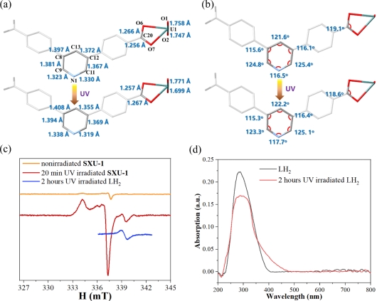 为了深入研究材料的光致变色机理,作者对光照前后SXU-1的单晶结构进行解析。如图ab所示,光照后SXU-1的局域结构发生了明显的变化:1、有机配体吡啶环中的键长和键角发生变化;2、有机配体羧基中的C-O键长发生变化;3、铀酰离子中U=O键长整体缩短。为了探究材料结构变化的机理,作者还采集了光照前后材料和配体的EPR光谱和UV-vis光谱(图c,d)。研究发现,光照诱导材料产生了氧自由基和氮自由基。由此可见,该材料在光照过程中产生了光生自由基,微观上影响了材料的局域结构,宏观上导致了材料的颜色产生明显变化。