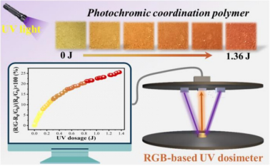 紫外(UV)光是一种常见的非电离辐射,在涉及光催化、固化、光刻、消毒等化工行业中被广泛使用。人体暴露在过量的紫外线中会对皮肤产生有害影响,可能导致恶性黑色素瘤或皮肤癌。然而,传统UV光探测器常常面临一些不足,包括复杂和高成本的制造程序,需要多次操作和昂贵的仪器才能获得可读输出,这极大地限制了它们大范围的应用。为了解决这些问题,研究人员开发了光致变色材料并应用于低成本和高灵敏的UV光检测。光致变色材料通常在受紫外光或可见光照射时表现出明显的颜色变化。因此,可通过肉眼观察材料颜色变化大致判断光照剂量,实现可视化紫外光监测。然而,这种类型的紫外光检测策略只能提供半定量的剂量信息。为了实现紫外光剂量的精准检测,作者开创性地将光致变色材料引入至光电设备中,精准读取材料颜色的RGB参数,并与辐照剂量构建相关关系,最终实现紫外光的在线监测。