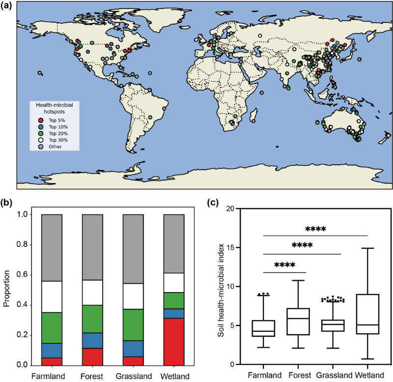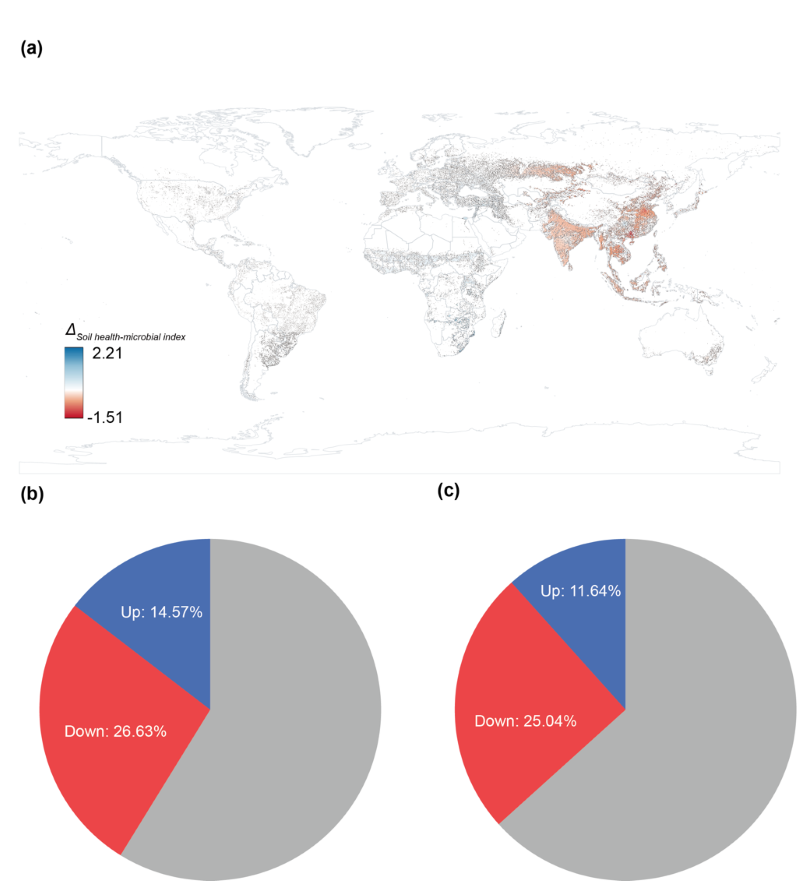 自人类世以来,集约化农业中的土壤微生物群落正面临农药污染、气候变化、人类经济活动和土地利用等多重人为因素的压力。然而,这些因素之间的相互作用尚未被深入研究。研究团队通过分析来自全球的2,326个土壤宏基因组数据,提出了一种综合性的土壤健康-微生物指数,该指数整合了微生物多样性、养分循环潜力、代谢活性、初级生产力以及健康风险等多方面指标,用于评估土壤微生物群落健康在农药和人为干扰因素影响下的响应情况。