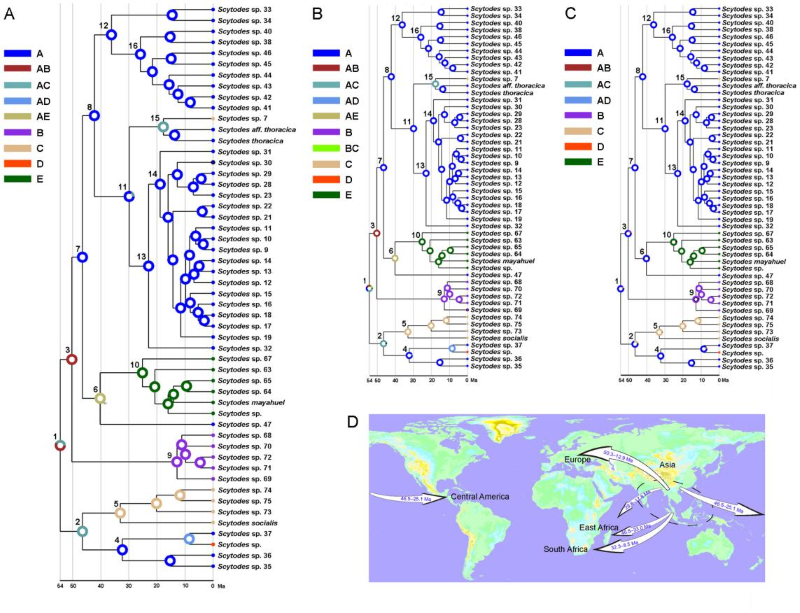唾蛛(图1)也叫喷液蛛,属于蜘蛛目花皮蛛科。唾蛛有大型毒腺,捕捉猎物时先向猎物喷射一注可瞬间凝固的粘性物质,将猎物钉在地上,再用蛛丝绑住后将其吃掉。亚洲季风自热带印度大陆延伸到温带东亚,是地球上独特的、强大的径向大气环流系统。科学界猜测印度季风带来的水汽通道影响了生物多样性形成,那么季风是如何影响唾蛛分布的呢?论文基于23年世界范围内花皮蛛(唾蛛)样本(84种),根据6个基因序列数据的谱系地理分析发现:1)胸纹花皮蛛种组在大约46.5–33.0百万年前,从东南亚/南亚地区向东非/南非扩散,且在晚中新世时期次数明显增多;2)扩散事件发生时间暗示,印度季风驱动胸纹花皮蛛种组从亚洲到非洲间的区系交换;3)该类蜘蛛的扩散模式暗示,从始新世中期开始,当印度季风从南北方向转向东西方向时,胸纹花皮蛛种组的扩散方向也发生了相应地转变(图2和图3)。该工作得到国家自然科学基金(32170463,31860602,31660611,31460554)支持,(文章链接:https://doi.org/10.1111/gcb.17596)。