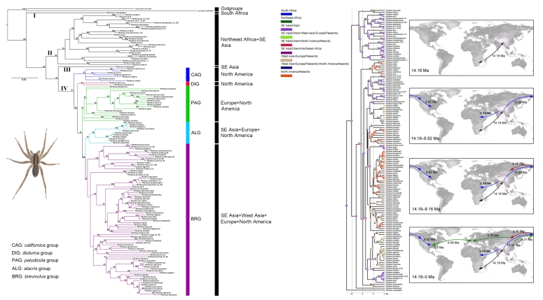 图4.全部豹蛛的谱系地理格局及扩散历史