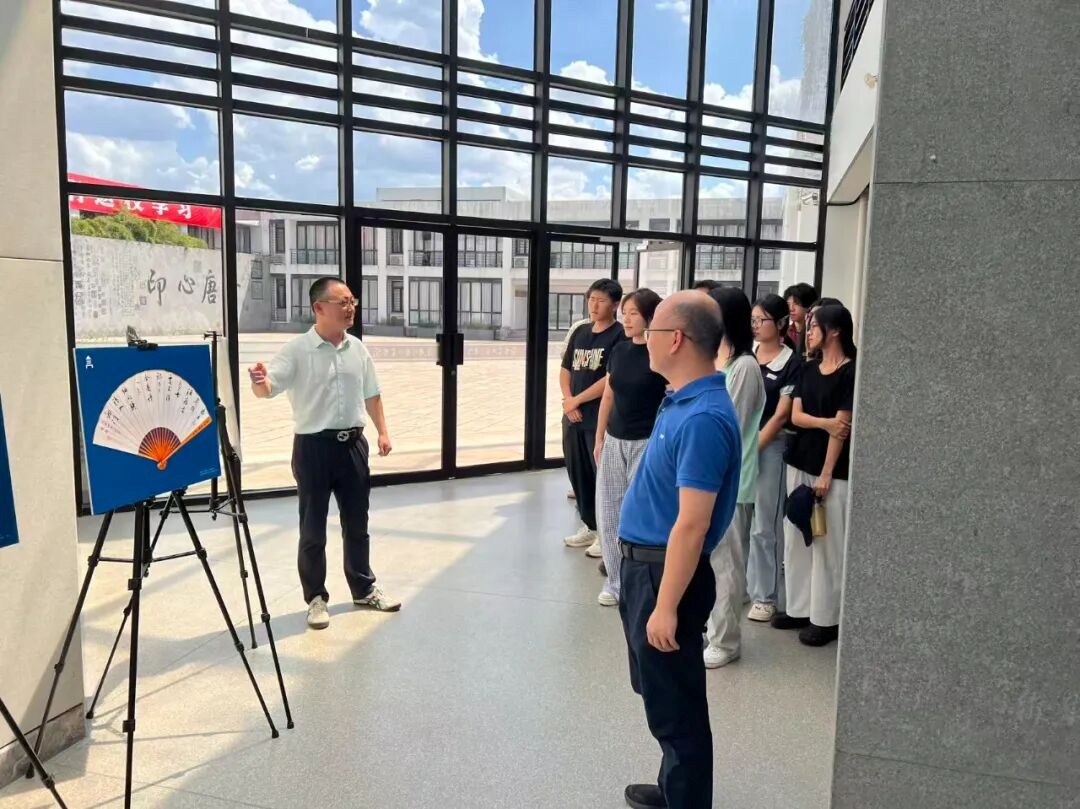 随后,章世焘老师为观展同学带来一场生动的导览授课。他从扇面的弧形制式与空间布局入手,细致讲解构图要领、笔墨技法及字体选择,并结合陆游经典诗作进行解析,帮助师生深入理解扇面书法的艺术内涵与精神价值。